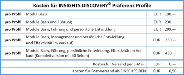 Mitarbeitern und Kunden vertieft wird und die typischen Muster anderer transparent gemacht wird. Mit diesem Wissen kann der Kunde im Beruf effektiver und erfolgreicher agieren.