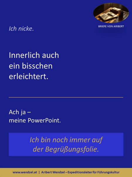 Ich starte mit einer Begrüßungsfolie. Spreche an, was sie sich vermutlich gerade denken. Einige lächeln darauf sogar. Ich erzähle Ihnen, wie ich als